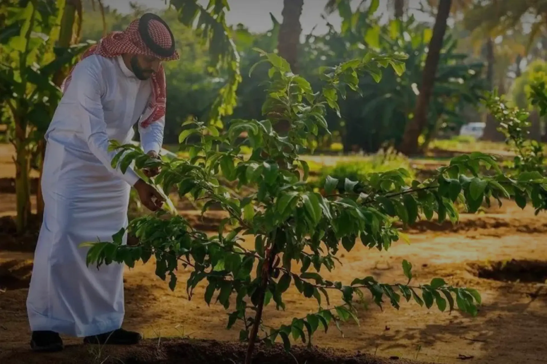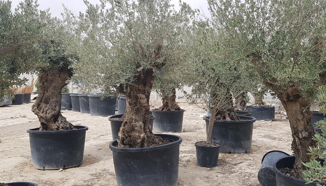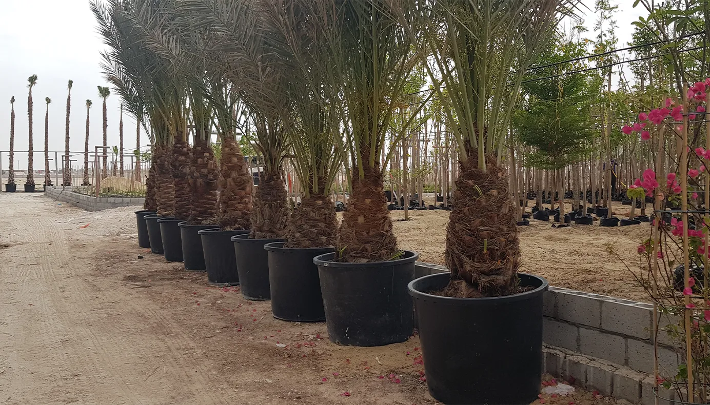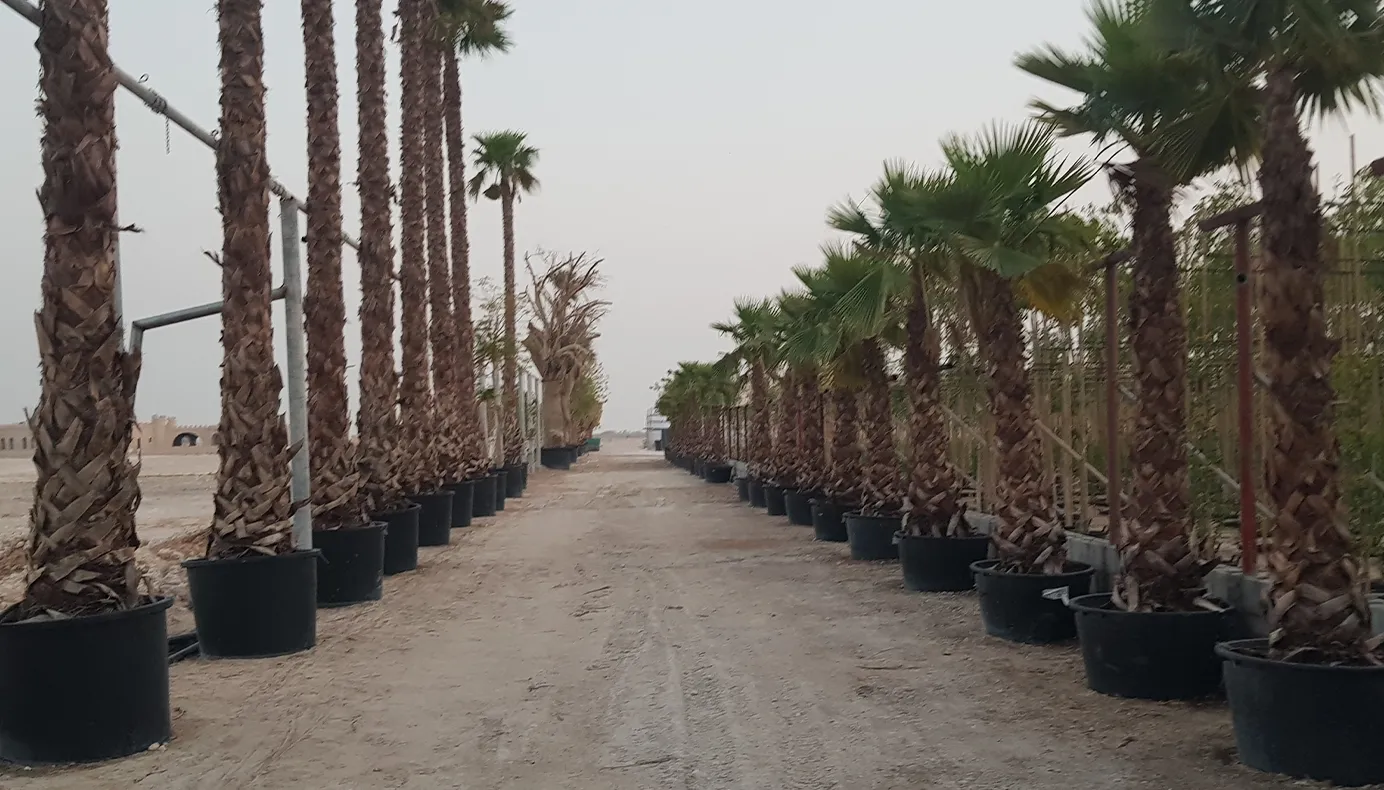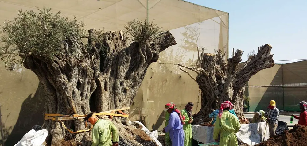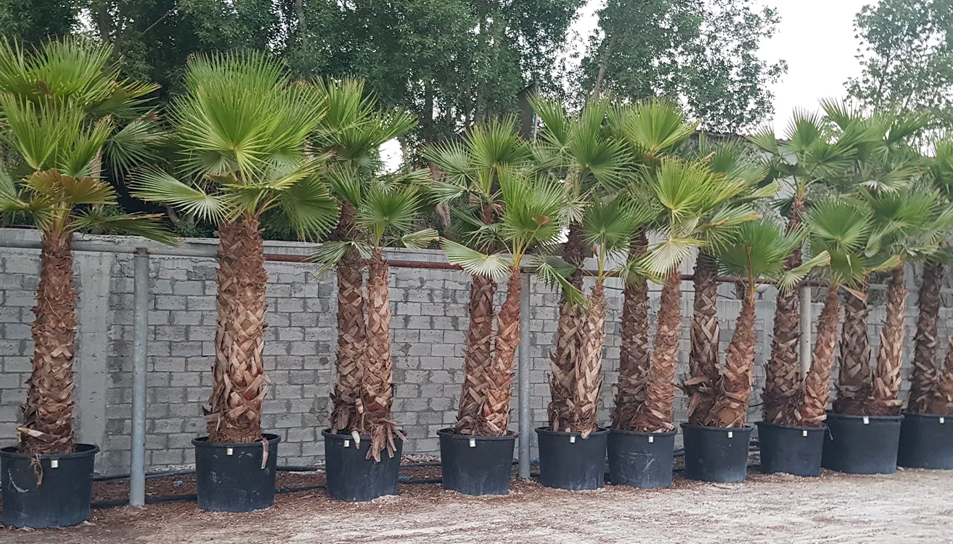 Imported palms, flowering trees, and olive trees suited to local climates.